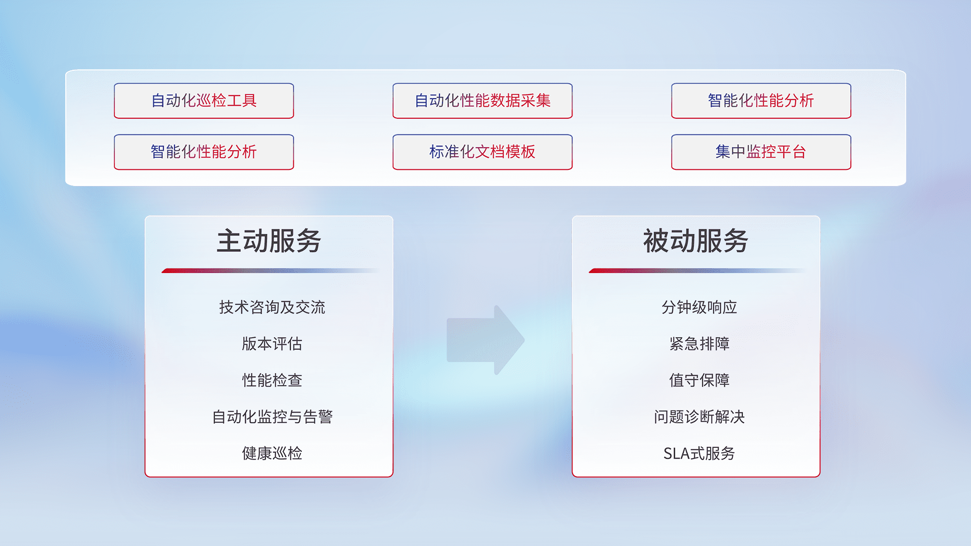 智能化工具和标准化文档,,保障服务质量,,,,提供主动服务(包含技术咨询、、、版本评估、、、性能检查、、、自动化监控与告警、、健康巡检)和被动服务包含(分钟级响应、、紧急排障、、值守保障、、、问题诊断解决、、、SLA服务)。。。。